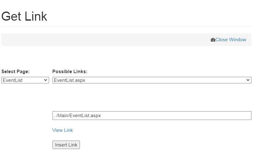 • Click on Get Local link, select Event List/Event view from the select Page drop down menu and click on Insert Link.