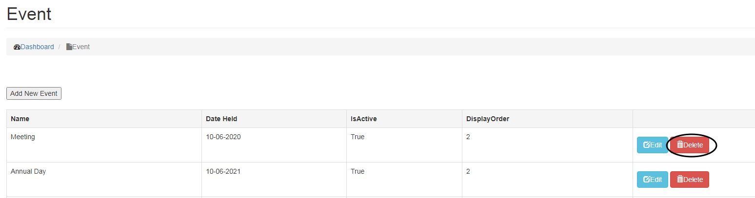 • To Delete an Event, click on Delete button.