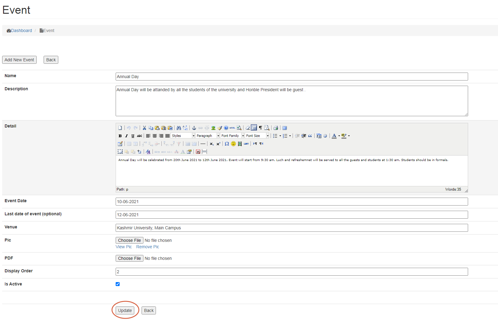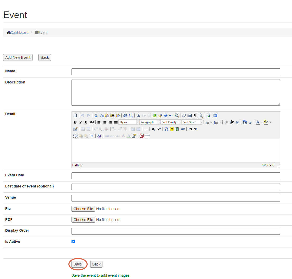 Is Active allows user to select whether the event is to be made Visible or not on the website. User can enter details of an event and select Is Active option later to reflect it on the website.