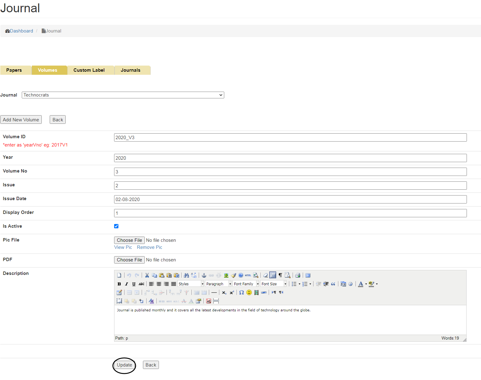 This part of the content Management System helps you to add and update information related to journals Published by the department.