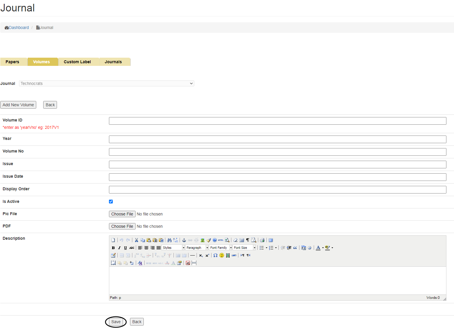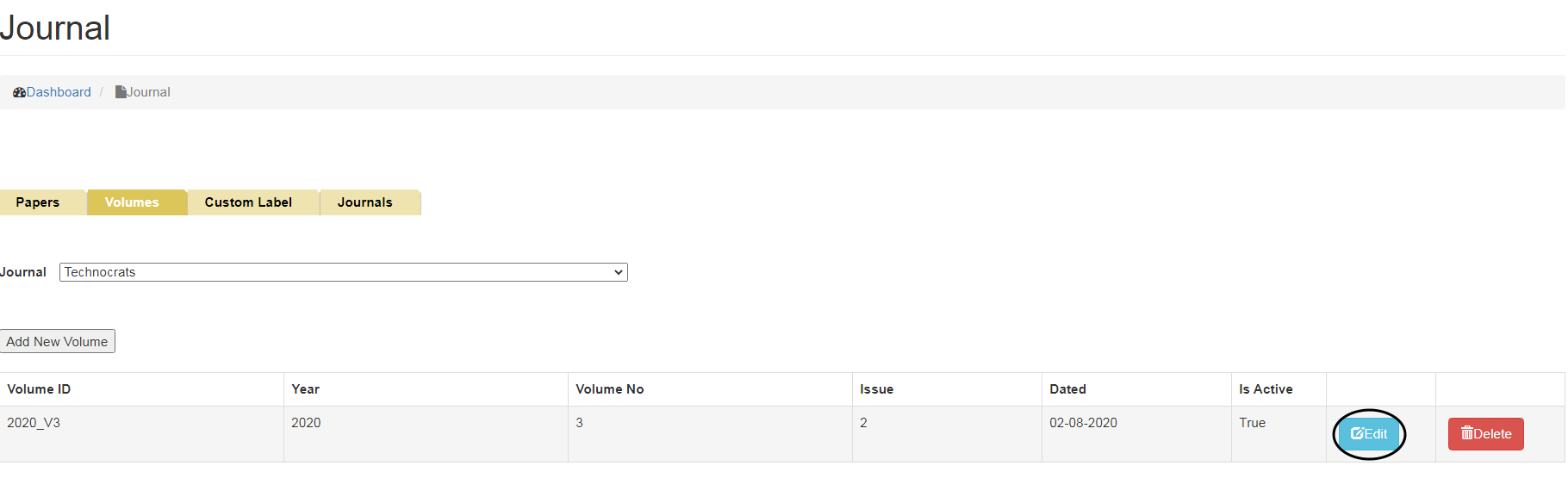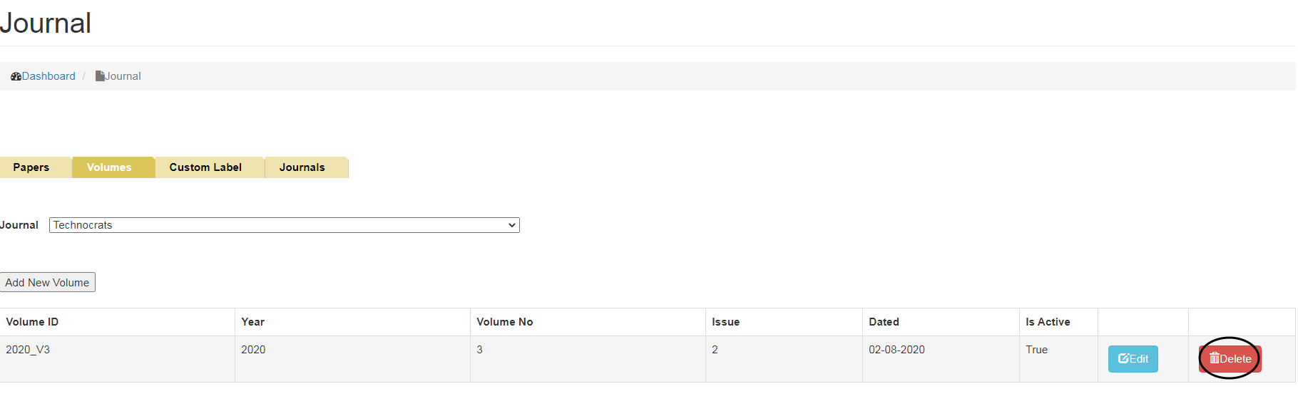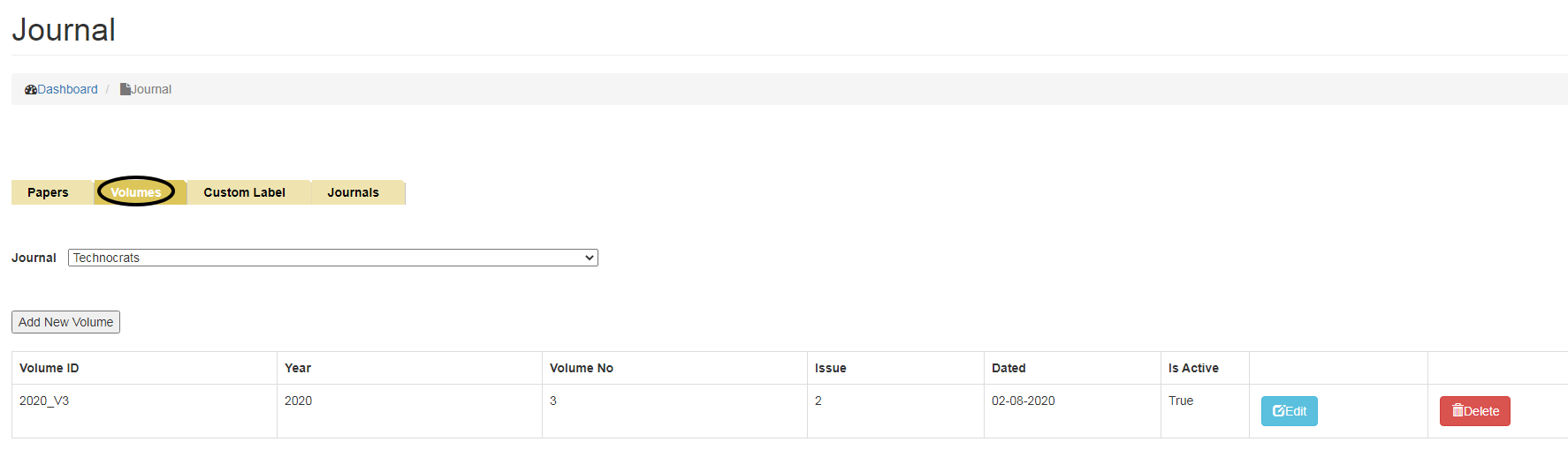 To Add New Volumes, click on Volumes tab and select the Journal name from the drop down menu for which you want to add Volume.
