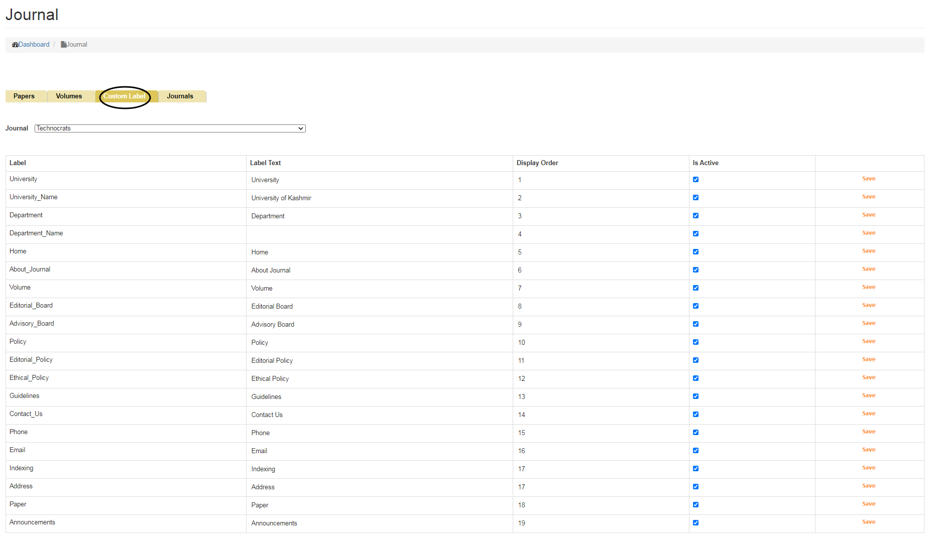 Is Active allows user to select whether the Journal is to be made Visible or not on the website.