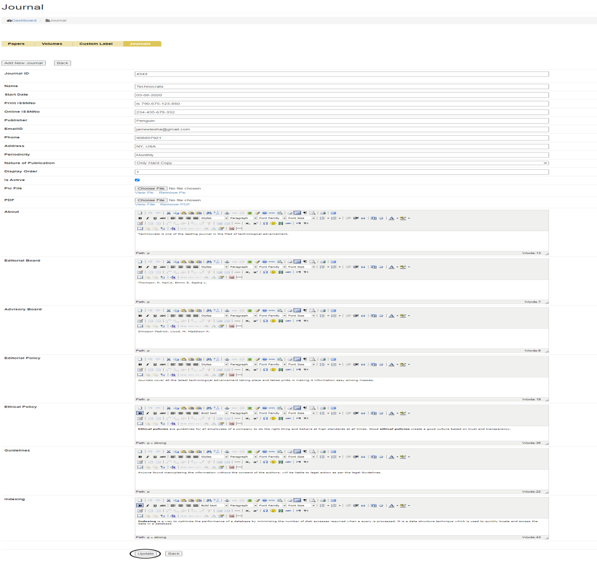 After clicking on Add new journal tab, it will take you to the page wherein you can enter all the details related to Journal which includes: